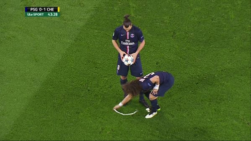 Champions-League-Achtelfinale PSG vs. Chelsea: Schlitzohr Luiz verlegte für Schlitzohr Ibrahimovic den Ort der Ausführung eines Freistoßes um fast einen Meter, indem er den Schaum einfach aufnahm und ein Stückchen weiter links wieder am Rasen verteilte.